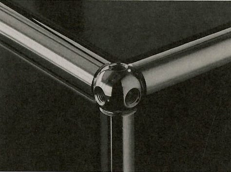 In the case presented here, in anticipation of high-tech fashion, a system of metal nodes and chrome tubes (the USM Haller model).