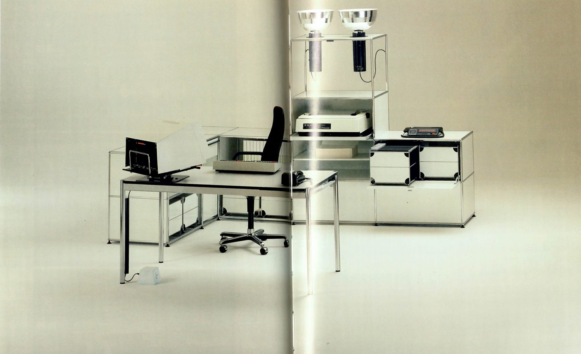 Images of the USM office interior, and the office welcome desk with the first edition of USM systems.